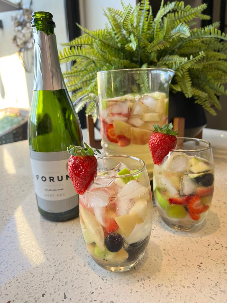 Corte todas as frutas em pequenos pedaços e disponha em uma jarra. Acrescente o espumante e a tônica delicadamente, misture delicadamente, complete de gelo e sirva.