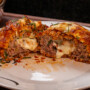 Em uma forma coloque o molho de tomate, os polpetones, mais molho por cima e os queijos; leve ao forno para gratinar.